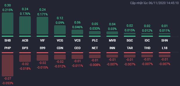 Vào cuối phiên giao dịch, tình thế một lần nữa bị lật ngược khi sự hồi phục quay trở lại và các chỉ số đều kết phiên trong sắc xanh. Các mã như MSN, GVR, SHB, VCG, VCS, ACB, FPT… đồng loạt tăng giá tốt và góp công lớn trong việc giữ sắc xanh của các chỉ số. Trong đó, MSN tiếp tục tăng đến 2,3% lên 89.900 đồng/cp, GVR tăng 2,3% lên 15.250 đồng/cp, SHB tăng 1,9% lên 16.100 đồng/cp, VCG tăng 1,2% lên 41.600 đồng/cp. Mới đây, VCG thông báo triển khai mua lại tối đa 44,17 triệu cổ phiếu làm cổ phiếu quỹ, tương ứng tỷ lệ 10% số lượng cổ ph-ếu đang lưu hành từ ngày 16/11 đến 15/12.
