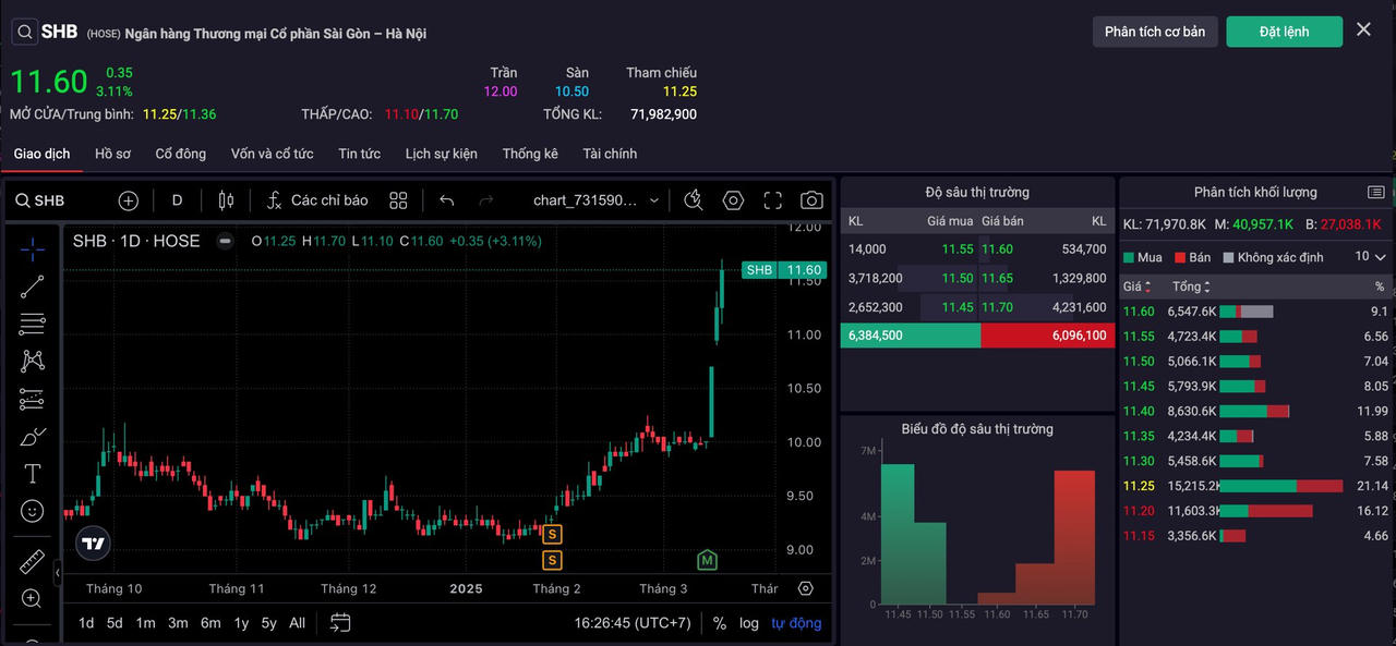 Kết thúc phiên giao dịch 18/3, cổ phiếu SHB của Ngân hàng TMCP Sài Gòn - Hà Nội tiếp tục nối dài đà tăng khi đóng cửa cao hơn mức tham chiếu 3,11% với hơn 72 triệu đơn vị được khớp lệnh. Trước đó, trong 2 phiên giao dịch 17/3 và 14/3, SHB cũng ghi nhận thanh khoản kỷ lục với lượng cổ phiếu được khớp lệnh lần lượt là 94,58 và 132,32 triệu đơn vị.