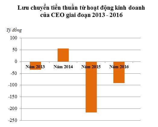 Cụ thể, ngoại trừ năm 2014 dương 55,8 tỷ đồng, nhưng sau đó, lưu chuyển tiền thuần từ hoạt động kinh doanh của CEO Group luôn ở mức âm: Năm 2013 âm 34,9 tỷ đồng và năm 2015 âm 215,8 tỷ đồng, năm 2016 âm 91,5 tỷ đồng.