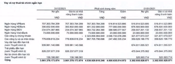 Tổng khoản vay tại BIDV hơn 234 tỷ đồng có ngày đáo hạn trong tháng 8, tháng 9/2022. Khoản vay tại viettinBank có giá trị 73 tỷ đồng, được thế chấp bởi chính trái phiếu ViettinBank, có ngày đáo hạn trả nợ vào tháng 11/2022. Ngoài ra còn khoản vay tín chấp với các công ty và cá nhân khác gần 800 tỷ đồng lãi suất 8%-12%.