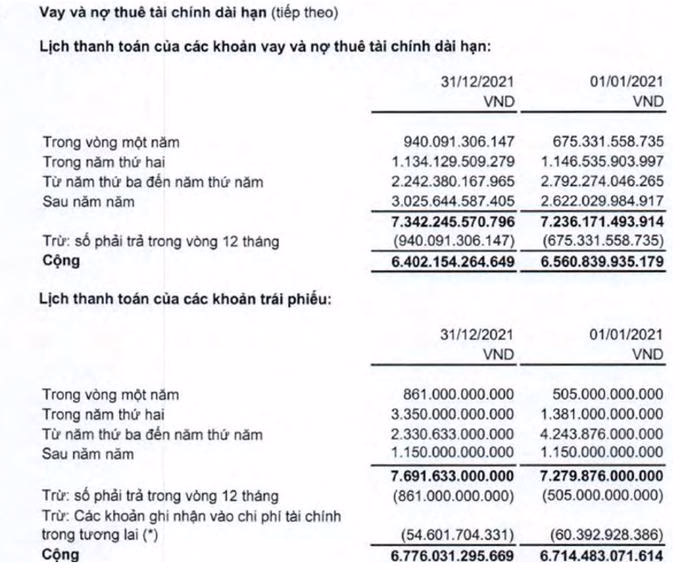Dư vay nợ thuê tài chính dài hạn gần 13.200 tỷ đồng. Tổng vay nợ thuê tài chính ngắn và dài hạn xấp xỉ 17.000 tỷ đồng. Chi phí lãi vay phải trả trong năm 2021 hơn 1.100 tỷ đồng. Trong tổng vay dài hạn, có hơn 6.400 tỷ đồng tiền vay tại các ngân hàng và tổ chức, cá nhân (gần 1.100 tỷ đồng). Số còn lại gần 6.800 tỷ đồng là trái phiếu phát hành.