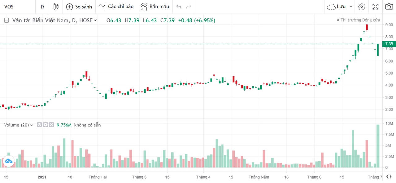 Đáng chú ý, trong những ngày gần đây, giá VOS “chạm” trần liên tục 10 phiên trước khi bị chặng đứng bằng hai phiên giảm sàn ngày 29/6 và 30/6. Hiện giá cổ phiếu VOS đang giao dịch quanh mức 7.390 đồng/cổ phiếu (kết thúc phiên ngày 2/7), thanh khoản có phiên lên đến 9.5 triệu cổ phiếu/phiên. So với hồi đầu năm, giá cổ phiếu của doanh nghiệp vận tải biển này đã tăng gấp 3 lần. Giá trong phiên giao dịch thấp nhất ở mức sàn và cao nhất ở mức trần. Đây là cổ phiếu rất được quan tâm trong thời gian gần đây.