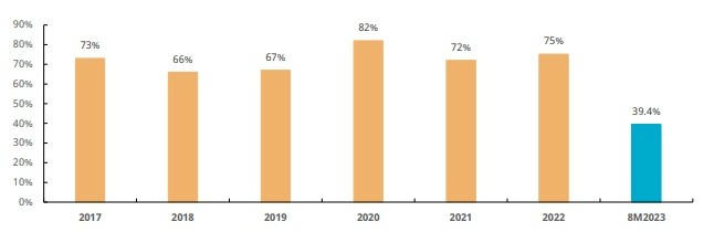 Đến cuối tháng 8/2023, ước tính giải ngân vốn đầu tư công của Việt Nam là 319.985 tỷ đồng, đạt 39,4% mục tiêu năm 2023. So với mục tiêu Thủ tướng Chính phủ giao, tỷ lệ giải ngân đạt 42,3%; trong đó, giải ngân trong nước đạt 292.187 tỷ đồng và giải ngân nước ngoài đạt 7.260 tỷ đồng, lần lượt đạt 40,1% và 25,9% kế hoạch.