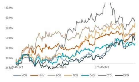 Tuy nhiên, dường như thị trường chưa bị tác động bởi yếu tố lợi nhuận và giá cổ phiếu tiếp tục tăng lên mức cao hơn. Tính đến thời điểm báo cáo, các cổ phiếu này tiếp tục vượt trội so với thị trường với mức tăng giá từ 40% - 80%, cho thấy kỳ vọng tương đối cao từ các nhà đầu tư.