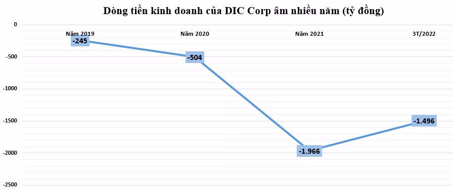 Được biết, 3 năm trở lại đây, dòng tiền kinh doanh của DIC Corp ngày càng lùi sâu về cực âm. Cụ thể, năm 2019 âm 245 tỷ đồng, năm 2020 âm 504 tỷ đồng và năm 2021 âm kỷ lục 1.966 tỷ đồng.