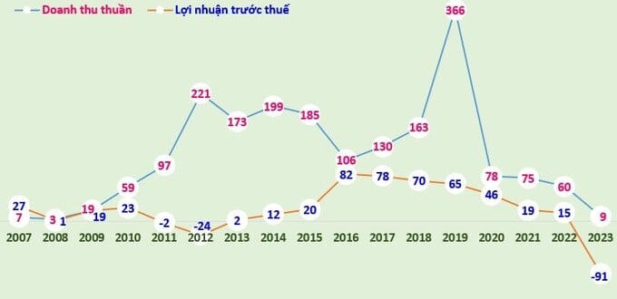Biểu đồ doanh thu thuần và lợi nhuận trước thuế của DRH Holdings giai đoạn 2007-2023