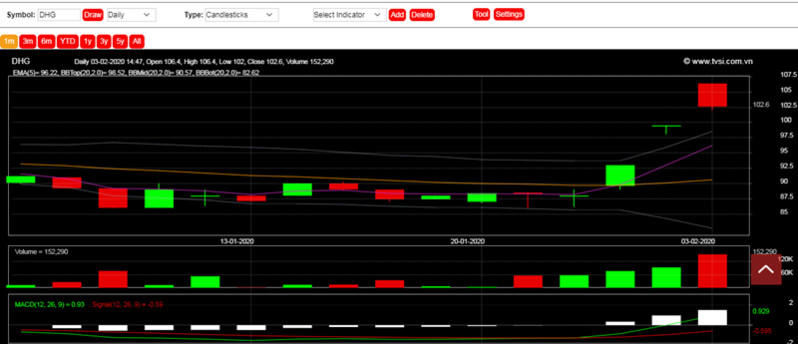 Kết phiên ngày 3/2/2020 vừa qua, cổ phiếu DHG của Dược Hậu Giang đang giao dịch ở mức 102.600 đồng/cp, tăng khoảng 14% so với ngày 22/1 (trước kì nghỉ lễ Nguyên Đán).