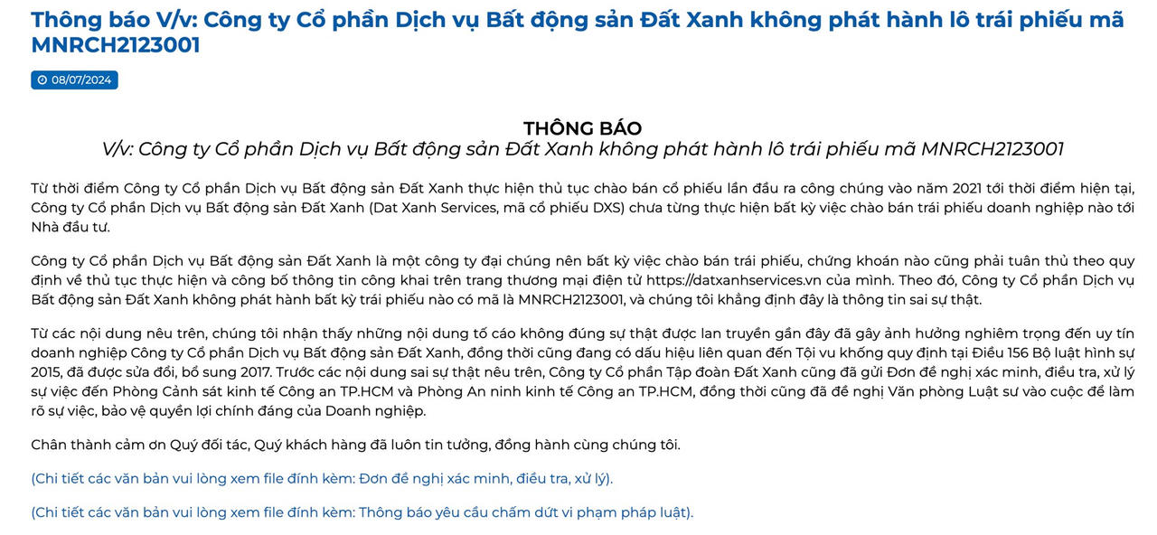 Tập đoàn này khẳng định, những nội dung nhóm nhà đầu tư đang tố cáo là hoàn toàn sai sự thật. Cụ thể, kể từ thời điểm thực hiện thủ tục chào bán cổ phiếu lần đầu ra công chúng (IPO) năm 2021 đến nay, Dat Xanh Services chưa thực hiện bất cứ thương vụ chào bán trái phiếu doanh nghiệp nào tới nhà đầu tư. Đối với lô trái phiếu MNRCH2123001 mà ông Triều đề cập, Tập đoàn Đất Xanh xác định, đơn vị phát hành là Công ty CP Đầu tư và Dịch vụ Đất Xanh Miền Nam.