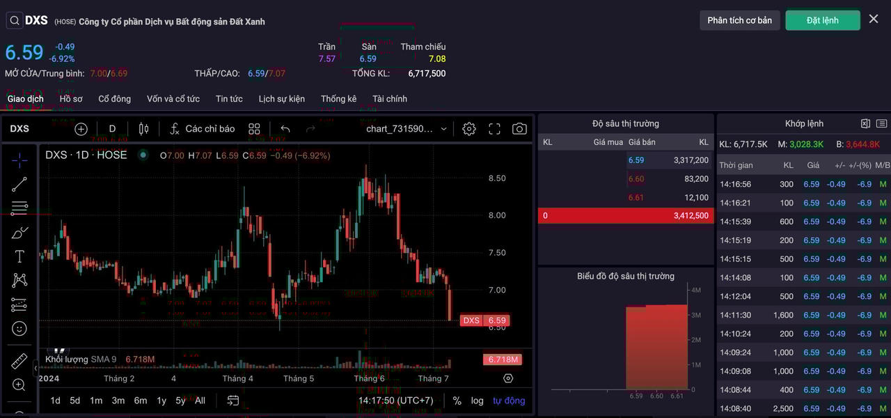 Trong đó, cổ phiếu DXS của Công ty CP Dịch vụ Bất động sản Đất Xanh (Dat Xanh Services) giảm kịch sàn trong tình trạng trắng bên mua, xuống còn 6.590 đồng/cp. Kết thúc phiên sáng, khối lượng dư bán ở mức giá sàn của cổ phiếu này là 2,8 triệu đơn vị. Đây cũng là phiên thứ tư liên tiếp cổ phiếu DXS giảm điểm.