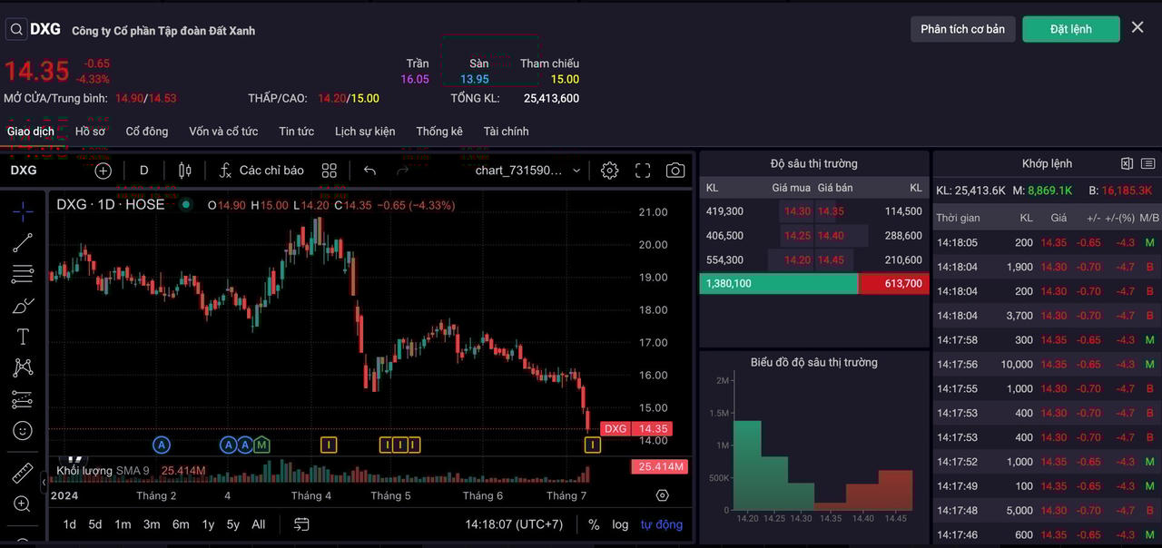 Tương tự, cổ phiếu DXG cũng nối dài chuỗi giảm điểm khi mất 4,33% giá trị, xuống còn 14.350 đồng.