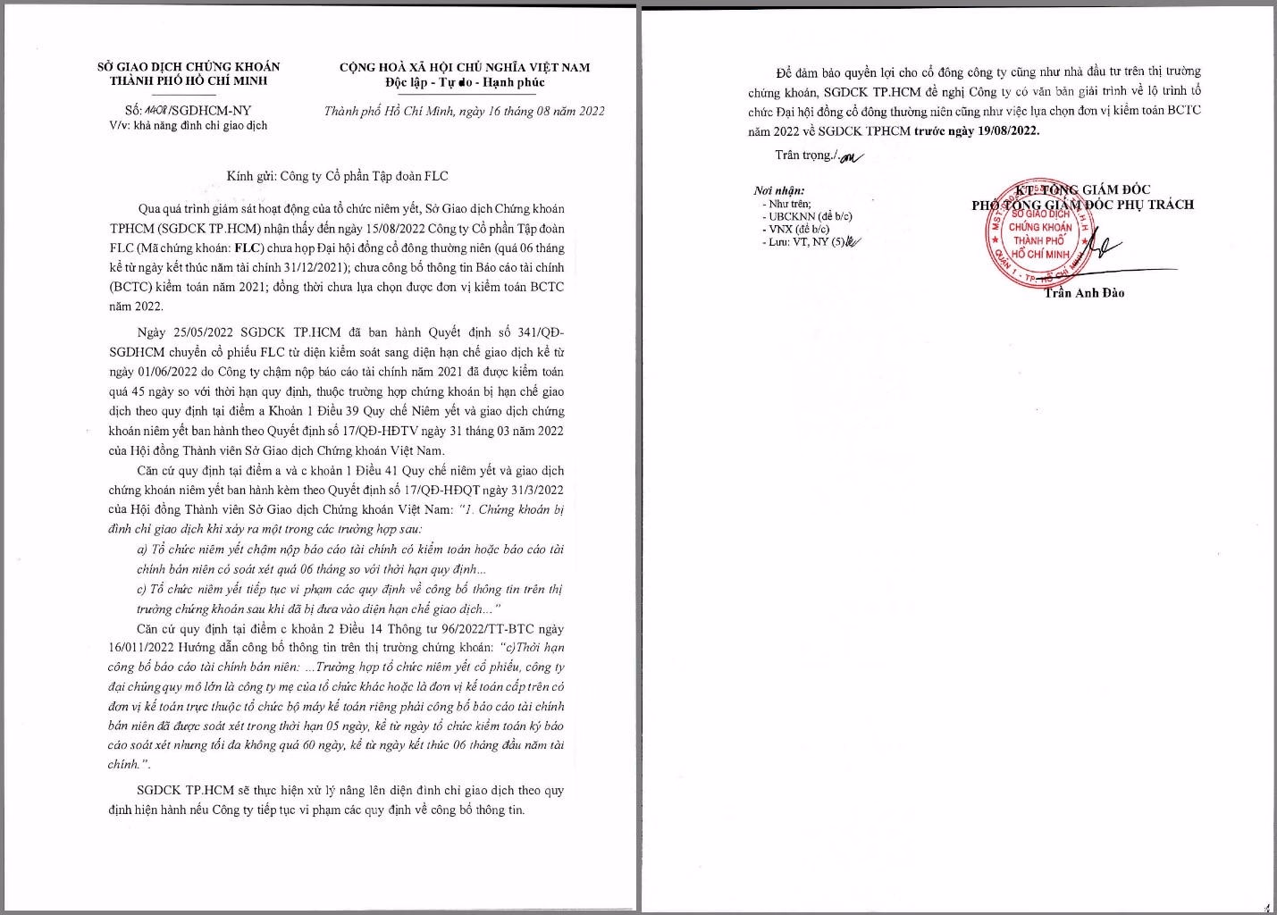 Trước đó, ngày 11/7, HoSE đã đưa cổ phiếu FLC vào diện cảnh báo vì chưa họp đại hội đồng cổ đông thường niên, quá thời hạn 6 tháng kể từ ngày kết thúc năm tài chính 31/12/2021; chưa công bố thông tin Báo cáo tài chính (BCTC) kiểm toán năm 2021, đồng thời chưa lựa chọn đơn vị kiểm toán BCTC năm 2022.