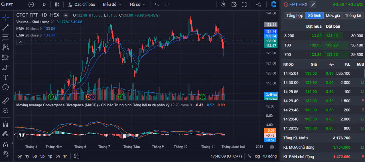 Thực tế, khối ngoại đã bắt đầu bán ròng mạnh cổ phiếu FPT từ tháng 5-6, thời điểm mã này đạt đỉnh quanh mức giá 140.000 đồng/cp. Hiện tại, dù đã điều chỉnh so với vùng đỉnh song cổ phiếu FPT vẫn được đánh giá ở mức tương đối cao khi giao dịch quanh mức 133.000 đồng/cp, cao hơn 60% so với đầu năm.