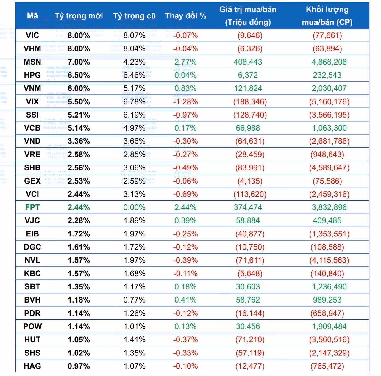 Tính chung từ cả hai quỹ, cổ phiếu FPT dẫn đầu danh sách mua ròng với hơn 13,7 triệu cổ phiếu. Theo sau là SHB với hơn 4,2 triệu đơn vị, MSN gần 3,7 triệu, HCM khoảng 3,4 triệu và EIB gần 2,9 triệu. Ở chiều bán, áp lực lớn nhất tập trung vào HPG (8,5 triệu cổ phiếu), SSI (hơn 7 triệu), VND (6,4 triệu), NVL (6,2 triệu) và VCI (gần 5,6 triệu).