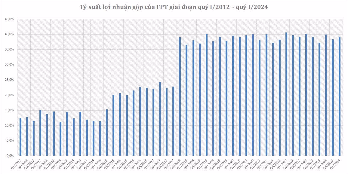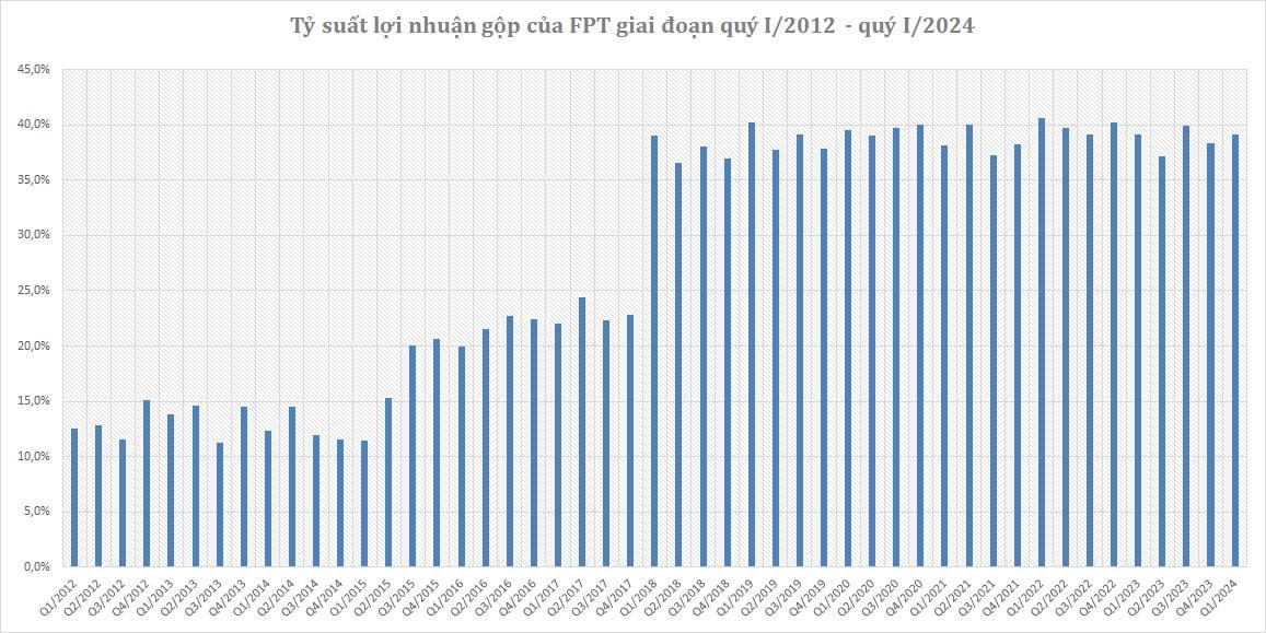 Sự bền bỉ của FPT còn được thể hiện ở việc duy trì ổn định biên lợi nhuận gộp. Cụ thể, kể từ sau khi bỏ sáp nhập FPT Retail, biên lợi nhuận gộp của FPT tăng vọt vào quý I/2018 và thường duy trì ổn định trong khoảng 35 - 40%.