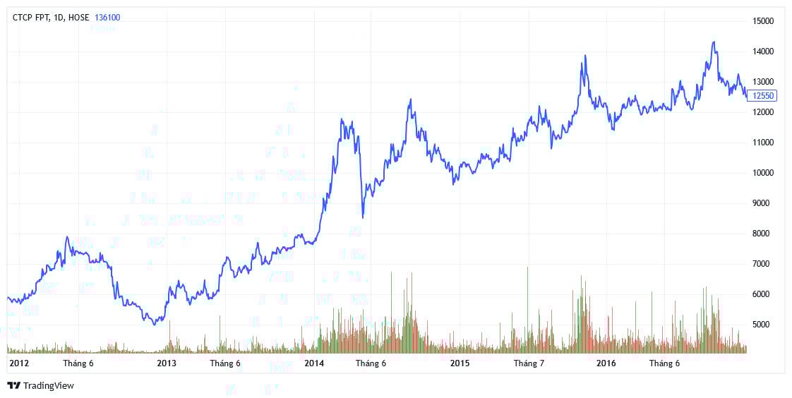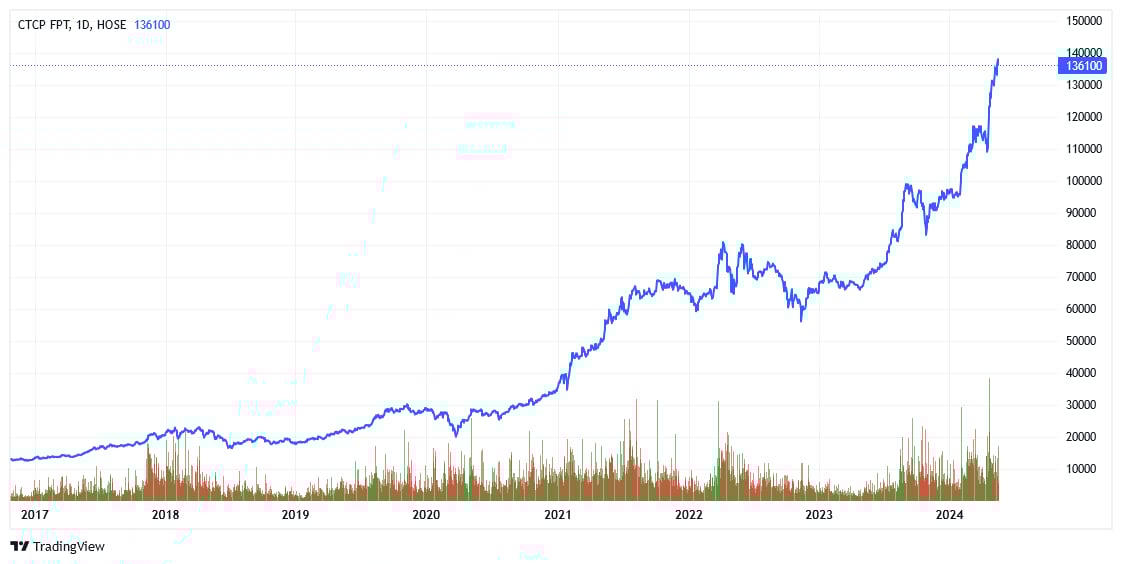 Sang đến giai đoạn 2017 – tháng 5/2023, thị giá FPT tăng từ khoảng 13.000 đồng/cổ phiếu lên khoảng 136.000 đồng/cổ phiếu, tương đương tốc độ tăng trưởng luỹ kế khoảng 37%/năm. Nôm na là sau chưa đầy 8 năm, nhà đầu tư nắm giữ trọn vẹn cổ phiếu FPT đã nhân 10 lần tài khoản.