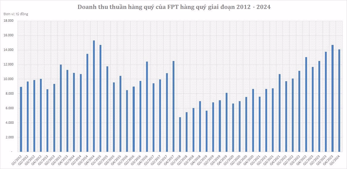 Dù “đắt” hay “rẻ” thì FPT giờ đây đã nổi lên như là cổ phiếu tích sản điển hình nhất, sau những “huyền thoại” như MWG hay VNM trước đây. Tính chất “điển hình” này không hẳn chỉ đến từ việc giá cổ phiếu giữ xu hướng đi lên trong thời gian rất dài bất chấp thị trường chung trải qua nhiều thăng trầm, mà còn đến từ sự bền bỉ tới đáng ngạc nhiên trong hoạt động kinh doanh.