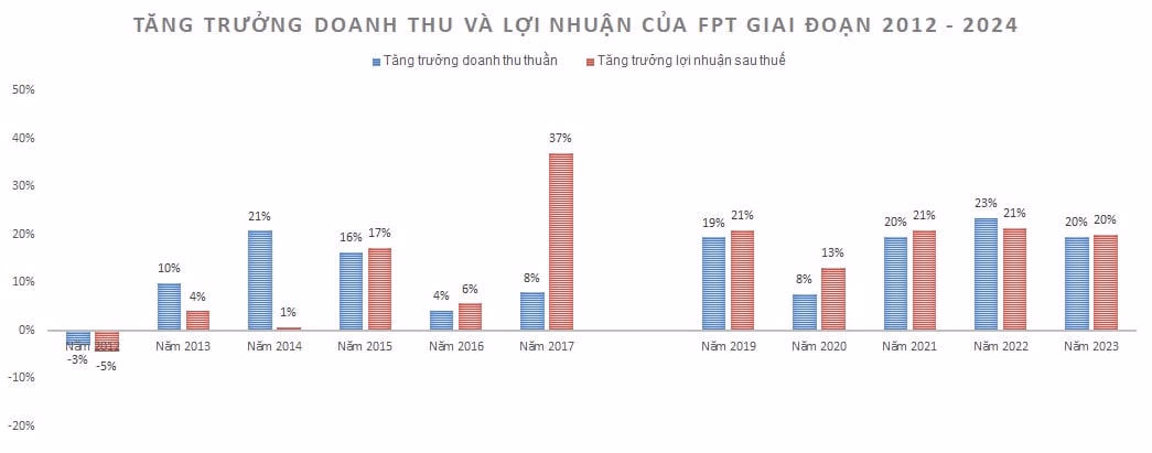 Tuy nhiên, từ sau khi bỏ sáp nhập FPT Retail, tăng trưởng doanh thu và lợi nhuận rất ổn định. Không kể năm 2018 - năm so sánh tăng trưởng không có nhiều ý nghĩa do chịu ảnh hưởng từ số liệu trước khi bỏ sáp nhập và sau khi bỏ sáp nhập FPT Retail, từ năm 2019 đến năm 2023, tăng trưởng doanh thu và lợi nhuận của FPT duy trì quanh mốc 20%, ngoại trừ năm 2020 chịu ảnh hưởng bởi dịch Covid-19 (lợi nhuận vẫn tăng hai chữ số). Trong quý I/2024, tăng trưởng doanh thu và lợi nhuận của FPT so với cùng kỳ năm trước đó tiếp tục giữ ở quanh mốc 20%.