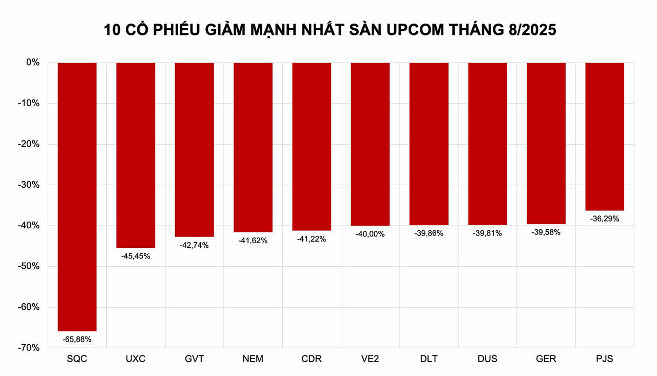 Theo sau SQC lần lượt là UXC (-45,45%), GVT (-42,74%), NEM (-41,62%), CDR (-41,22%), VE2 (-40%), DLT (-39,86%), DUS (-39,81%), GER (-39,85%), PJS (-36,29%).