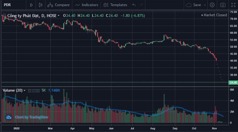 Kết thúc phiên giao dịch ngày 14/11/2022, cổ phiếu PDR tiếp tục giảm sàn về mức giá 24.400 đồng/cổ phiếu. So với mức đỉnh hồi tháng 12/2021, cổ phiếu PDR đã giảm hơn 65% thị giá, sau các thông tin lãnh đạo của công ty này bị “call margin” lên đến hàng triệu cổ phiếu.