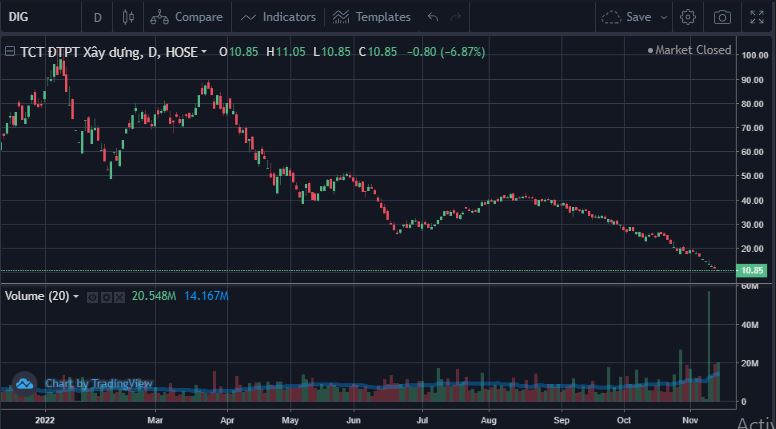Sau 5 phiên liên tiếp giảm sàn và phải giải trình, phiên 11/11, cổ phiếu DIG tiếp tục giảm sàn, xuống mức 11.650 đồng/cổ phiếu. Sang tuần mới (14/11/2022), cổ phiếu DIG lại tiếp tục giảm sàn về mức 10.850 đồng/cổ phiếu, giảm tới 90% so với mức đỉnh hồi đầu năm.