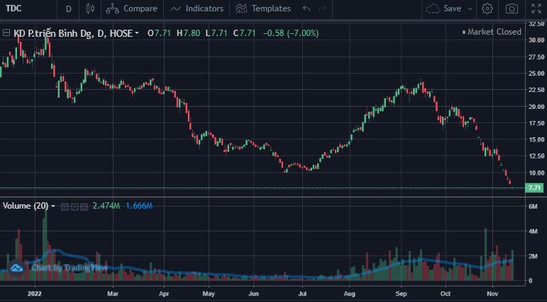 Trên thị trường sau 5 phiên giảm sàn liên tục (4 - 10/11/2022), phiên giao dịch ngày 11/11 cổ phiếu TDC tiếp tục giảm sàn thứ 6 liên tiếp. Chưa dừng lại, kết thúc phiên 14/11 thị giá cổ phiếu TDC tiếp tục giảm sàn về 7.710 đồng/cổ phiếu. So với mức đỉnh hồi đầu tháng 1/2022, cổ phiếu TDC đã giảm 73% thị giá.