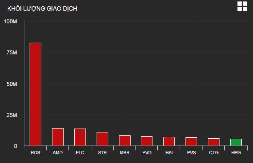 Thanh khoản thị trường ở mức tương đối với tổng khối lượng giao dịch đạt 413 triệu cổ phiếu, trị giá 4.800 tỷ đồng. Phiên hôm nay ROS đột biến thanh khoản với khối lượng khớp lệnh lên đến 82,3 triệu cổ phiếu. 2 cổ phiếu bất động sản khớp lệnh mạnh hôm nay là AMD và FLC với khối lượng lần lượt 13,8 triệu cổ phiếu và 13,7 triệu cổ phiếu.