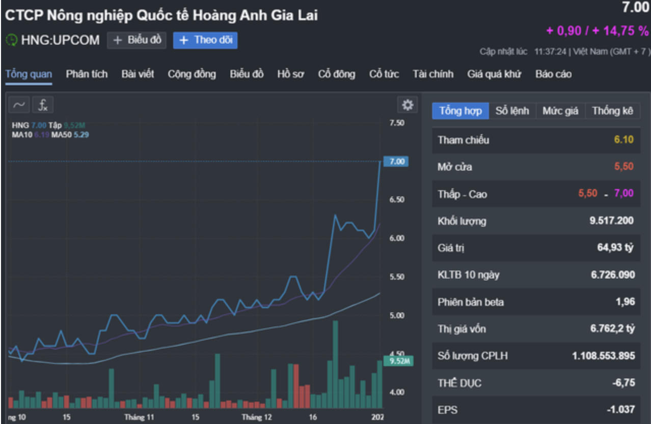 Cụ thể, cổ phiếu HNG của Công ty cổ phần Nông nghiệp Quốc tế HAGL (HAGL Agrico, mã chứng khoán: HNG) do ông Trần Bá Dương làm Chủ tịch HĐQT tăng kịch trần gần 15%, lên mức 7.000 đồng/cổ phiếu, cao nhất kể từ cuối tháng 8/2022.