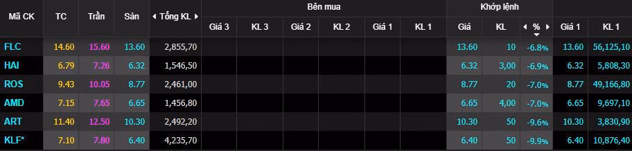 Trong sáng nay, nhóm FLC (ROS, FLC, HAI, KLF, AMD) là tâm điểm đáng chú ý khi đồng loạt bị bán mạnh, giảm sàn 'trắng bên mua' với dư bán lượng lớn, trong đó FLC và ROS dư bán lần lượt 56 triệu và 49 triệu cổ phiếu trong khi khối lượng khớp lệnh mới chỉ đạt 1-2 triệu đơn vị.