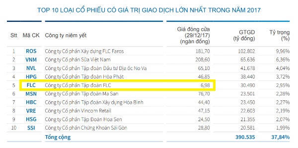 Năm 2017, Sở Giao dịch Chứng khoán TP. Hồ Chí Minh đã có thống kê xếp hạng Top 10 Cổ phiếu có Giá trị lớn nhất trong năm ở sàn HOSE. Thống kê của Sở Giao dịch Chứng khoán TP. Hồ Chí Minh, dễ thấy hầu hết đều là các công ty lớn nhất sàn về giá trị vốn hóa với giá cổ phiếu rất cao, trừ FLC.