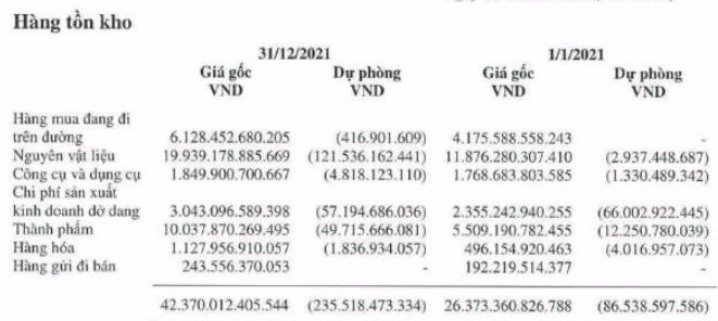 Điểm nghẽn thứ hai chính là giá nguyên vật liệu. Tại thời điểm cuối năm 2021, HPG có số dư hàng tồn kho đạt hơn 42.134 tỷ đồng, tăng mạnh so với con số 26.282 tỷ đồng đầu năm 2021.