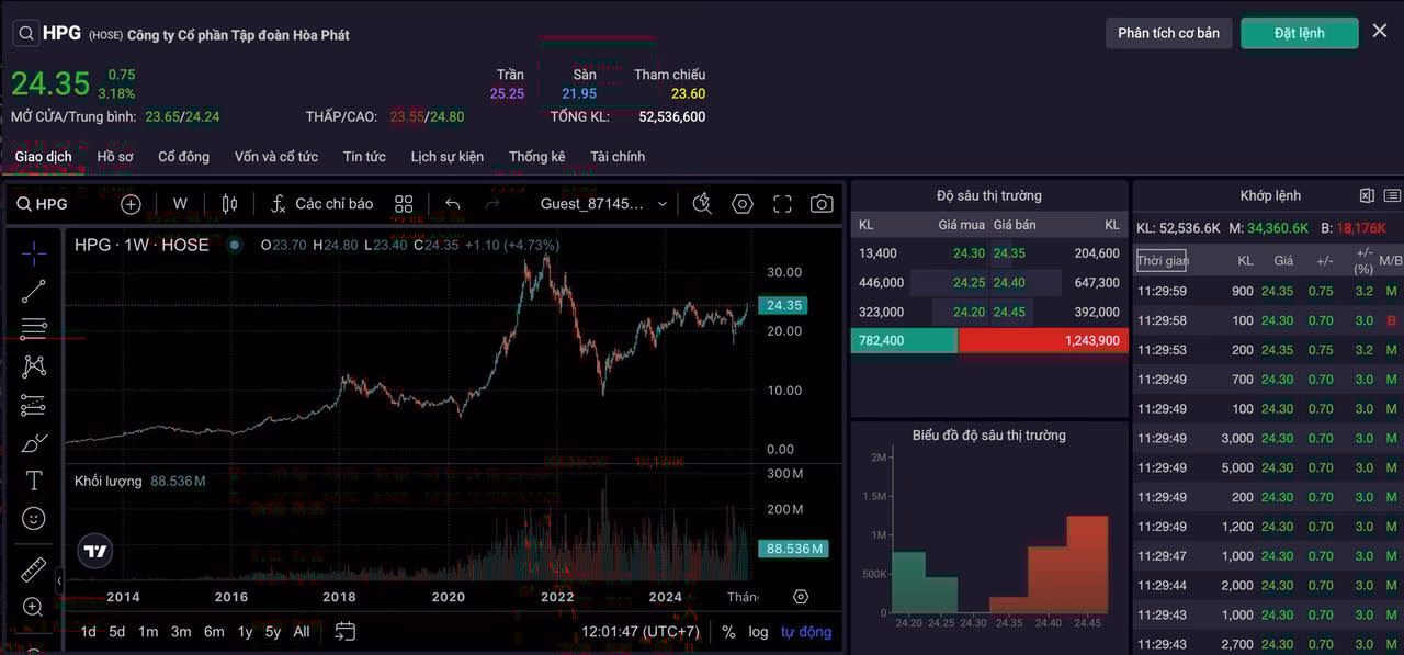 Trong đó, tâm điểm giao dịch thuộc về cổ phiếu HPG của Công ty Cổ phần Tập đoàn Hòa Phát. Khép lại phiên sáng, mã này tăng 3,18%, lên 24.350 đồng/cp, trở lại vùng đỉnh năm 2024. Với hơn 52 triệu cổ phiếu được khớp lệnh, cổ phiếu HPG dẫn đầu toàn thị trường về thanh khoản, cho thấy lực cầu mạnh mẽ trong bối cảnh nhà đầu tư kỳ vọng vào triển vọng kinh doanh tích cực của doanh nghiệp.