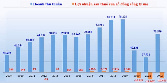 Doanh thu thuần và lợi nhuận sau thuế của cổ đông công ty mẹ của Vietnam Airlines giai đoạn 2009-2022, trong đó số liệu năm 2022 chưa được kiểm toán (đơn vị tính: tỷ đồng).