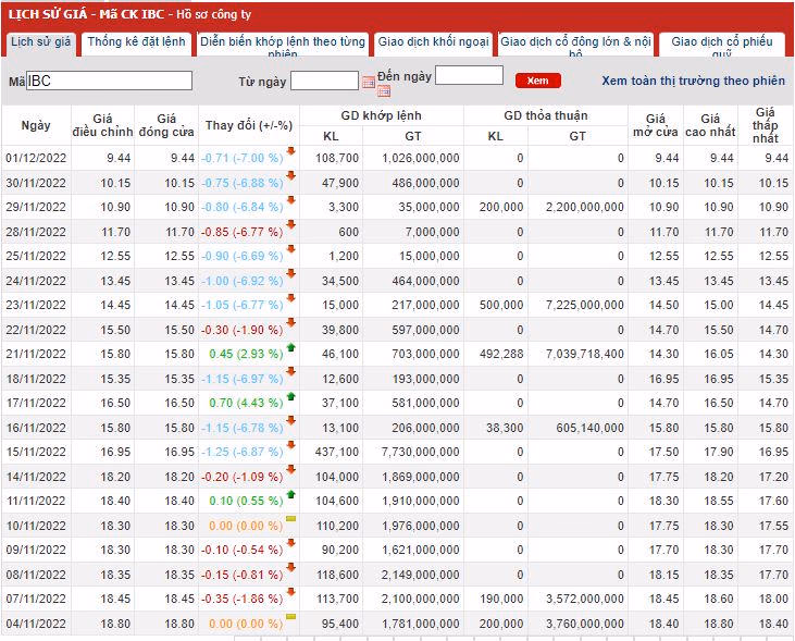 Tính đến hết phiên giao dịch ngày 1/12, cổ phiếu IBC của CTCP Đầu tư Apax Holdings giảm sàn còn 9.440 đồng với khối lượng giao dịch khớp lệnh 108,7 ngàn đơn vị cổ phiếu. Đây là phiên thứ 7 liên tiếp cổ phiếu IBC giảm sàn sau nhiều thông tin bất lợi. Nếu so với thời điểm đầu năm 2022, thị giá cổ phiếu IBC đã giảm tới 54%, từ 20.350 đồng/cổ phiếu (ngày 4/1/2022) còn 9.440 đồng/cổ phiếu (1/12/2022).