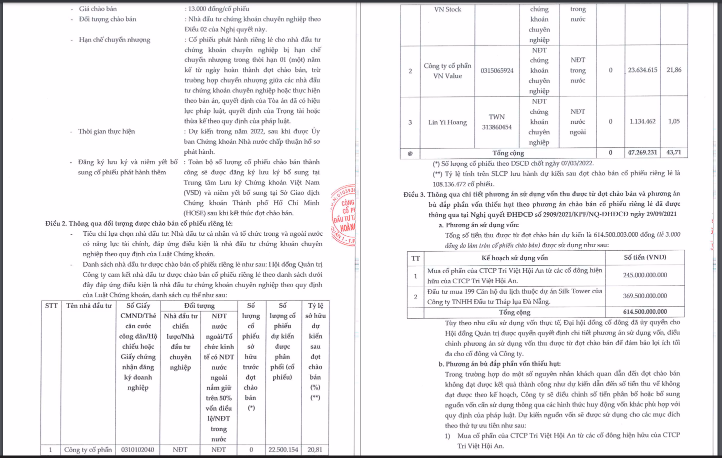 Tổng số tiền thu được từ đợt chào bán dự kiến hơn 1.273 tỷ đồng sẽ dùng 1.000 tỷ đồng đầu tư, góp vốn, mua cổ phần tại các công ty, dự án; số còn lại hơn 273 tỷ đồng để đầu tư kinh doanh bất động sản bằng cách tài trợ một phần vốn triển khai, hợp tác dự án… Sau phát hành, công ty tăng vốn điều lệ lên 2.611 tỷ đồng.