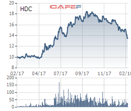 - Theo dữ liệu của chúng tôi, cổ phiếu HDC đã lao dốc mạnh kể từ tháng 10/2017 đến nay. Chỉ trong vòng 3-4 tháng, giá cổ phiếu đã rơi từ ngưỡng gần 18.500 còn 13.500 đồng.