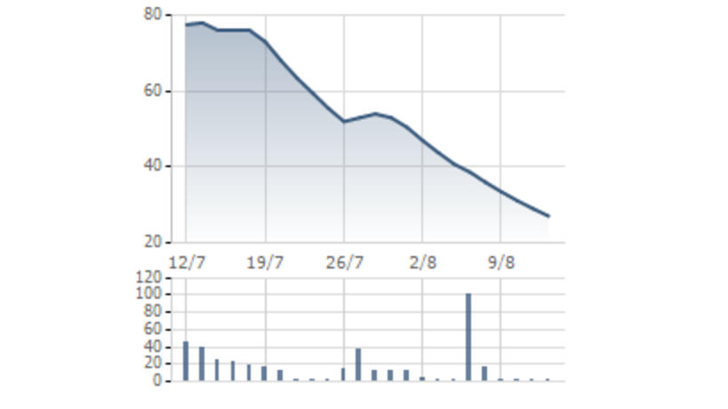 TNNĐ-Chỉ trong vòng 1 tháng từ 13/7 đến 12/8/2016, cổ phiếu DRH của Căn nhà Mơ Ước đã giảm từ 78.000 đồng/cp xuống 27.100 đồng/cp.