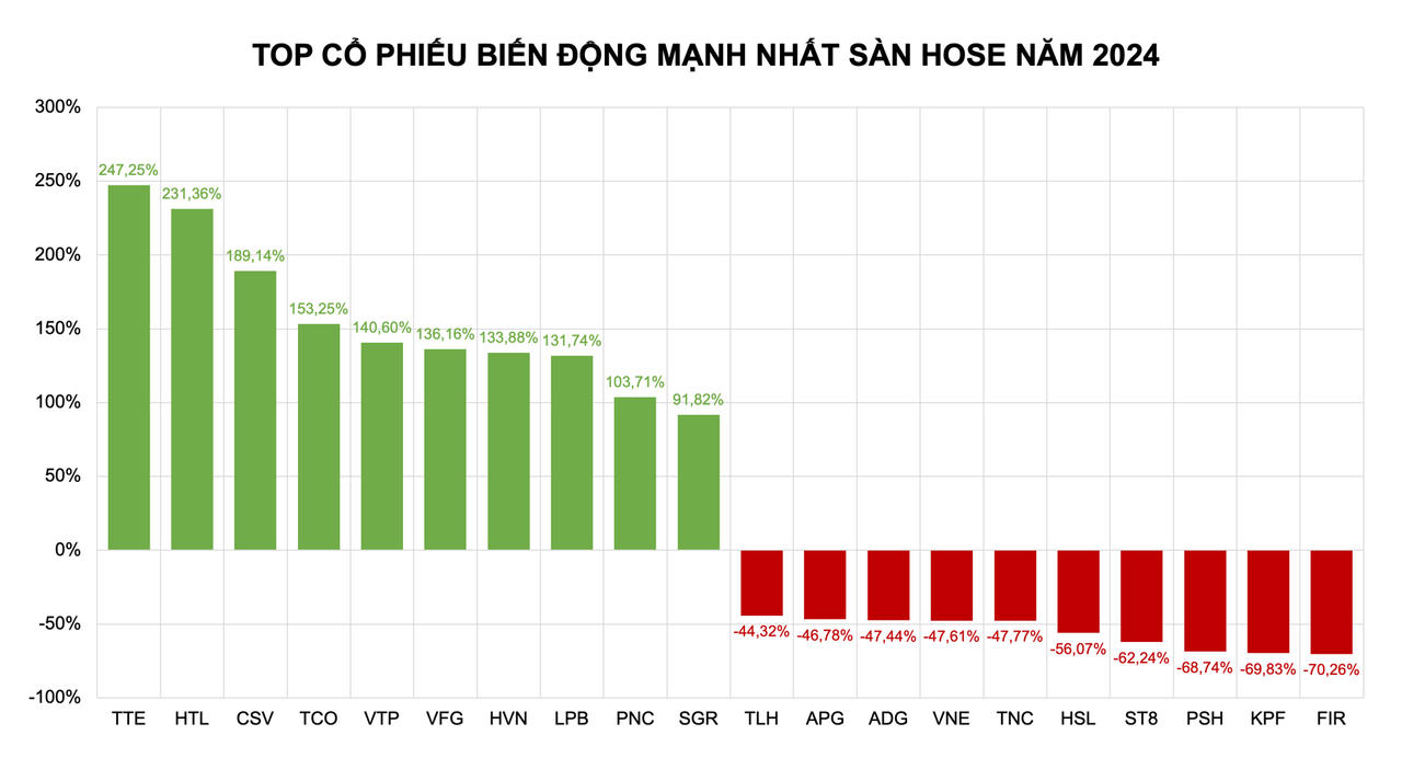 (VNF) - Năm 2024, thị trường chứng khoán ghi nhận đà tăng hàng trăm phần trăm của nhiều mã cổ phiếu. Phần lớn trong số đó đều mang "câu chuyện riêng" hấp dẫn.