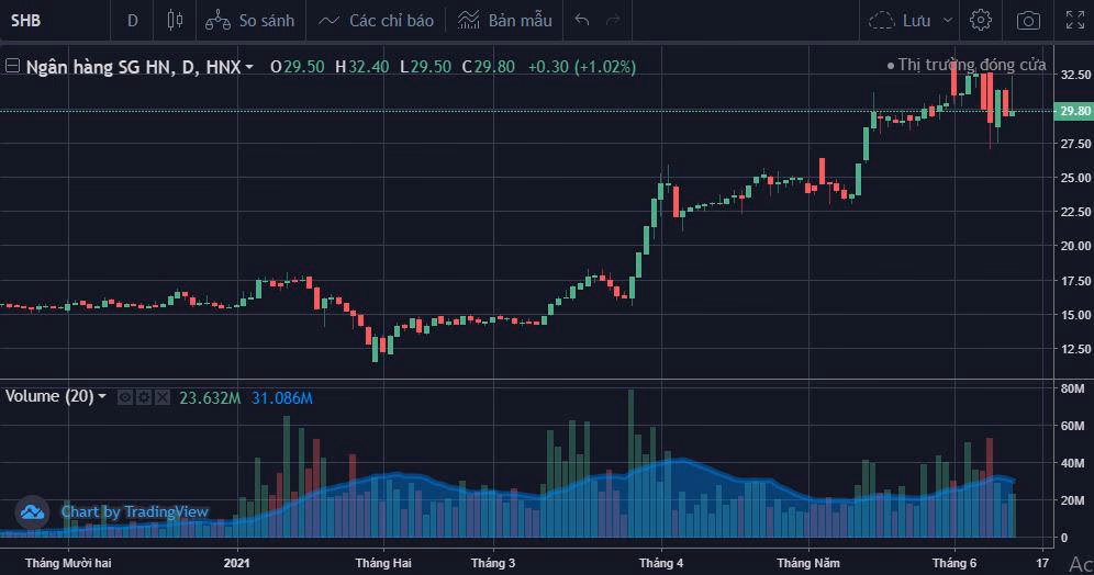 Thị giá SHB gần nhất bị kéo giảm về 29.500 đồng/cp vào phiên ngày 10/6, tương ứng giảm 10% từ vùng giá đỉnh 32.500 đồng/cp được xác lập vào ngày 4/6.