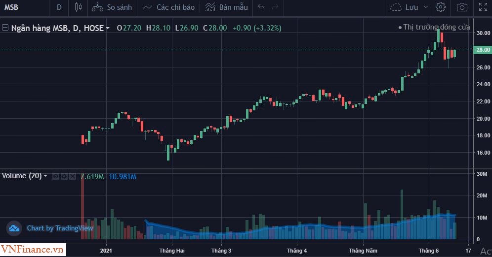 Kết phiên giao dịch ngày 11/6/2021, cổ phiếu MSB dừng lại ở mức 28.000 đồng/cp, tăng 65% kể từ lúc lên sàn HOSE.