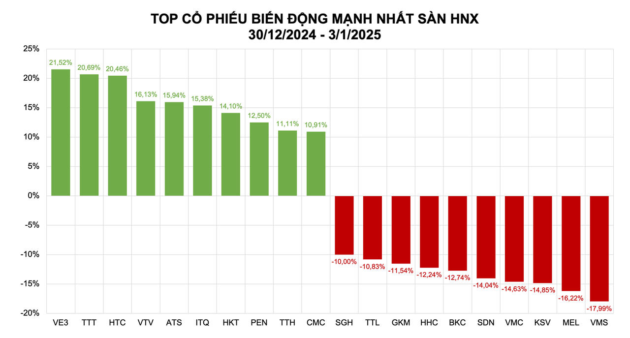 Trên sàn HNX, top 10 cổ phiếu tăng mạnh lần lượt là VE3 (+21,52%), TTT (+20,69%), HTC (+20,46%), VTV (+16,13%), ATS (+15,94%), ITQ (+15,38%), HKT (+14,10%), PEN (+12,5%), TTH (+11,11%), CMC (+10,91%).
