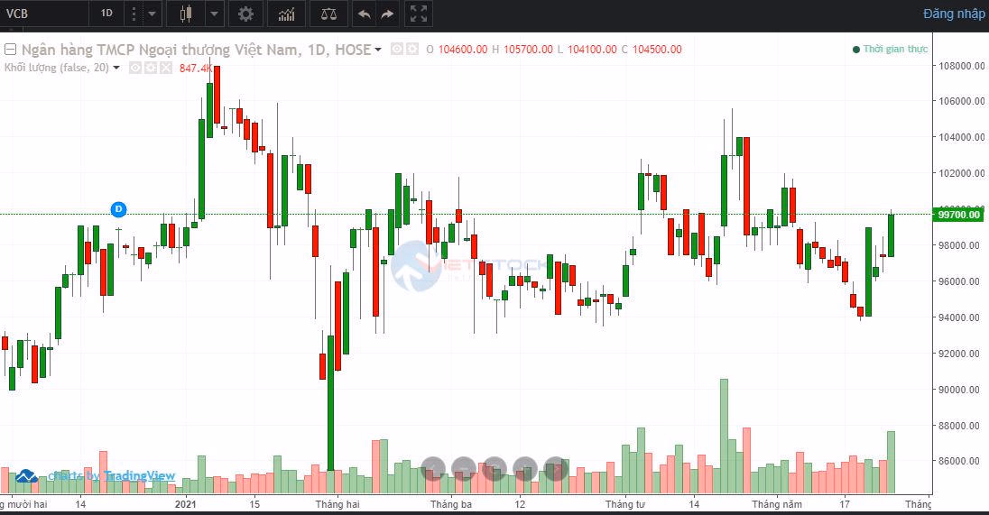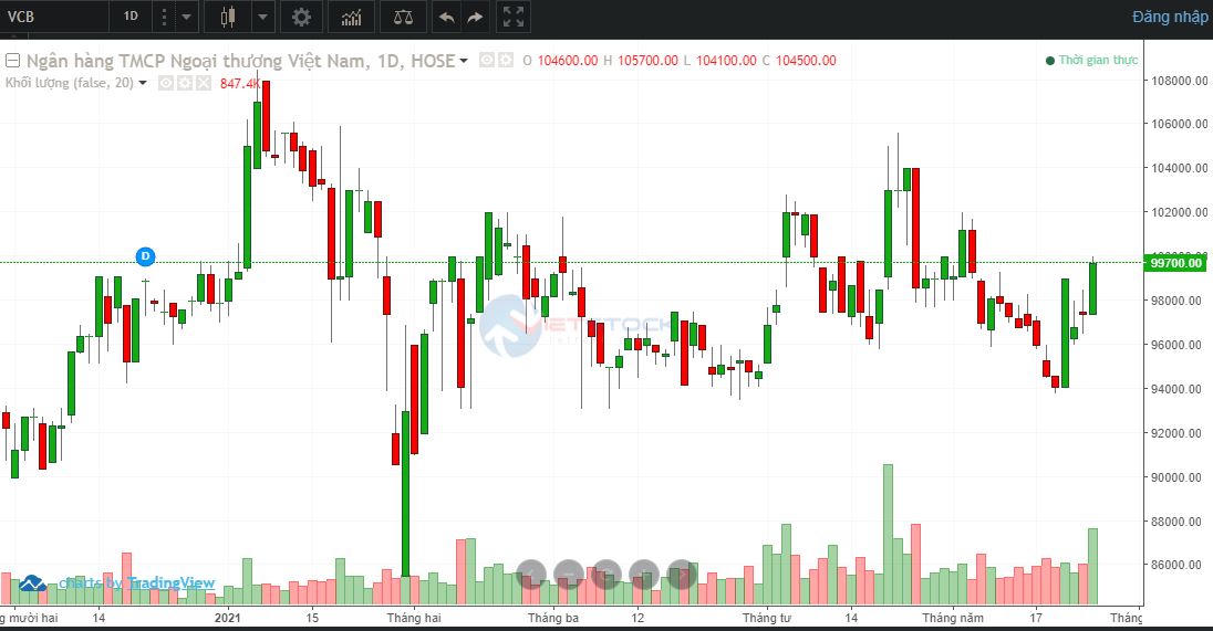 Đáng chú ý, cổ phiếu VCB của ngân hàng Vietcombank tuy là cổ phiếu đang có giá cao nhất, nhưng thời gian qua lại không chung "sóng" với các ngân hàng có giá rẻ hơn mà chỉ quanh mốc 100.000 đồng/cp. Chốt phiên giao dịch ngày 24/5, thị giá cổ phiếu VCB đứng ở mức 97.400 đồng/cp. Như vậy, so với mức giá 107.000 đồng/cp vào ngày 7/1/2021, cố phiếu VCB đã giảm 9%.