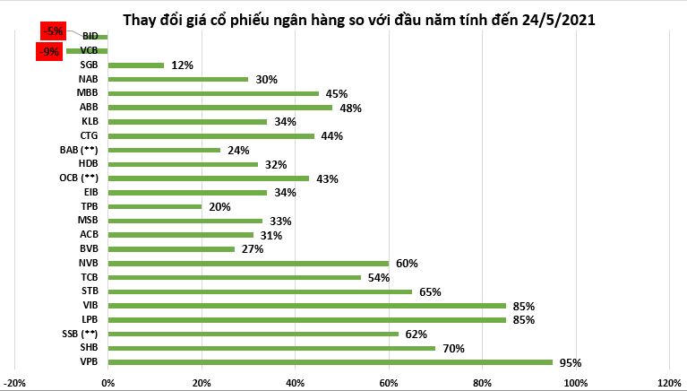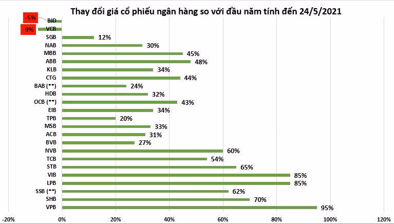 Chẳng hạn, giai đoạn từ 4/1/2021 đến 24/5/2021, cổ phiếu LPB của ngân hàng LienVietPostBank tăng 85% tạo đỉnh 23.400 đồng/cp, cổ phiếu STB của ngân hàng Sacombank tăng 65% đạt mốc 28.900 đồng/cp, cổ phiếu VIB cũng tăng 85% đạt mốc 61.000 đồng/cp, cổ phiếu TCB của ngân hàng Techcombank tăng 54% lên mốc 50.900 đồng/cp,...
