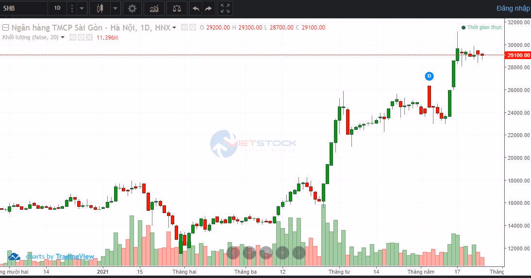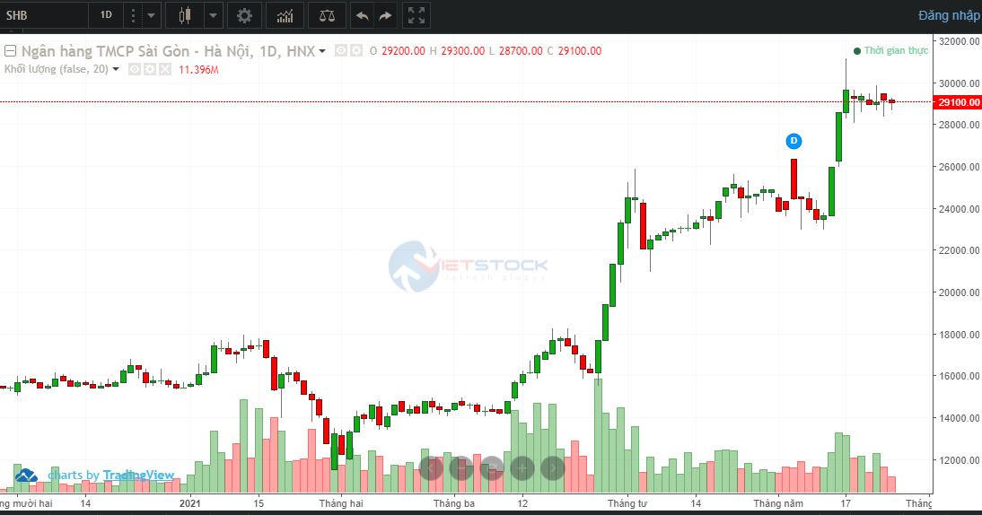 Còn nhớ, trong phiên cuối tuần ngày 14/5, SHB dẫn đầu đà tăng với mức kịch trần 10% (sàn HNX) lên 28.600 đồng/cổ phiếu, khối lượng giao dịch đạt hơn 42 nghìn đơn vị, trị giá trên 1.000 tỷ đồng.