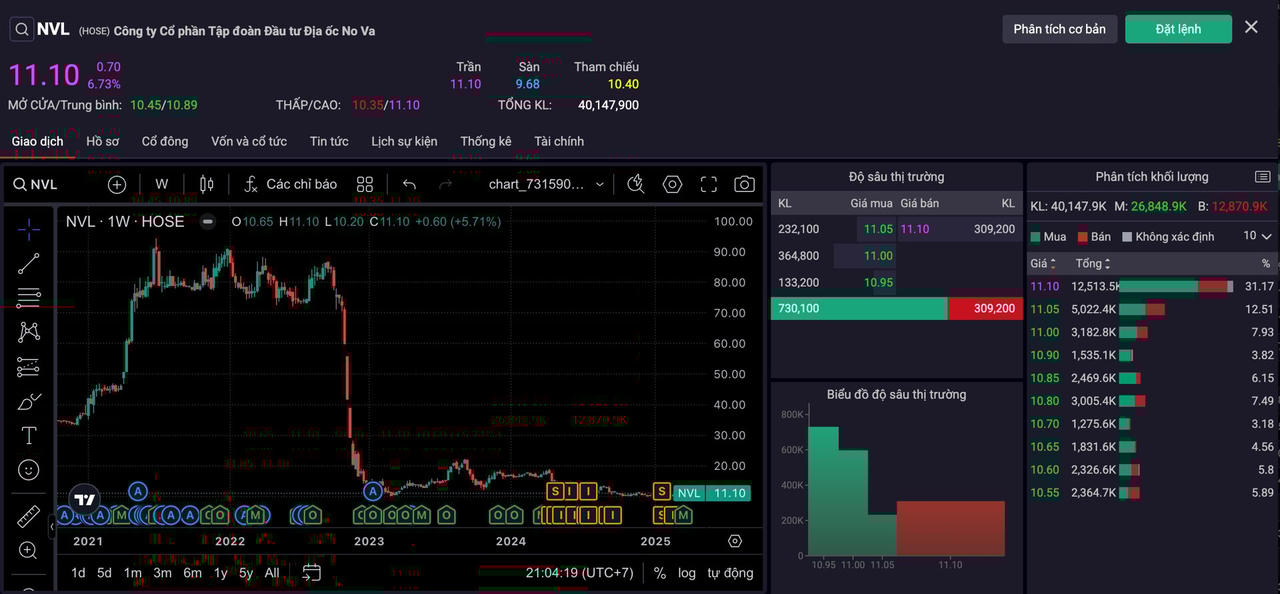 Xét theo phân tích kỹ thuật, cổ phiếu NVL đã tăng gần 28% từ vùng đáy, cho tín hiệu kết thúc xu hướng giảm. Đà tăng trong phiên hôm nay được hỗ trợ bởi thông tin tích cực liên quan đến vụ kiện của doanh nghiệp tại dự án trị giá 10.000 tỷ đồng.