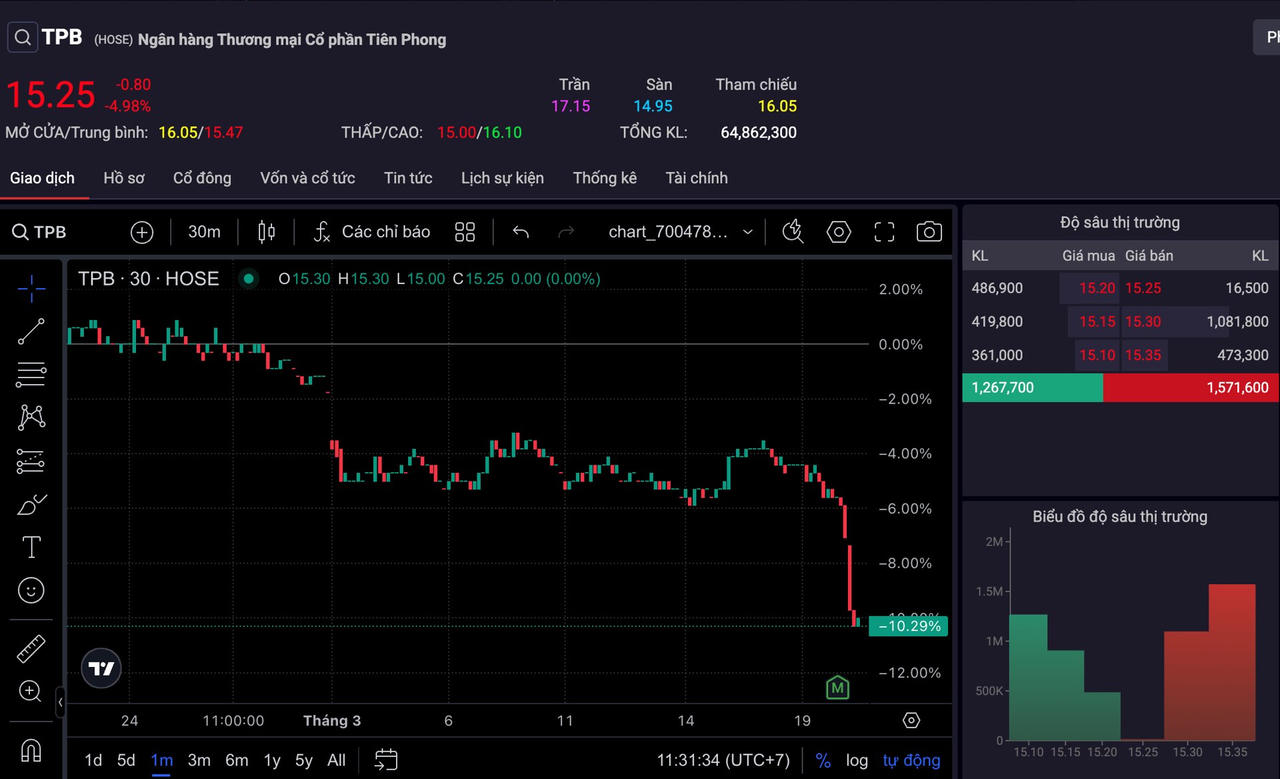 Cùng diễn biến với ORS, cổ phiếu TPB của Ngân hàng TMCP Tiên Phong (TPBank, HoSE: TPB) cũng ghi nhận áp lực bán lớn trong phiên sáng nay, giảm 4,98% xuống còn 15.250 đồng/cổ phiếu.
