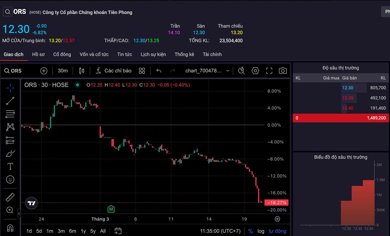 Trong phiên giao dịch sáng nay (20/3), cổ phiếu ORS của Công ty Cổ phần Chứng khoán Tiên Phong (HoSE: ORS) giảm kịch biên độ, lùi về mức giá sàn 12.300 đồng/cổ phiếu. Lực cầu bắt đáy gia tăng đáng kể khi khối lượng đặt mua áp đảo bên bán, tuy nhiên phần lớn lệnh mua đều tập trung ở mức giá sàn. Điều này phản ánh tâm lý nhà đầu tư kỳ vọng ORS đã chạm vùng đáy, tranh thủ tích lũy cổ phiếu nhưng vẫn thận trọng, chưa sẵn sàng nâng giá mua.