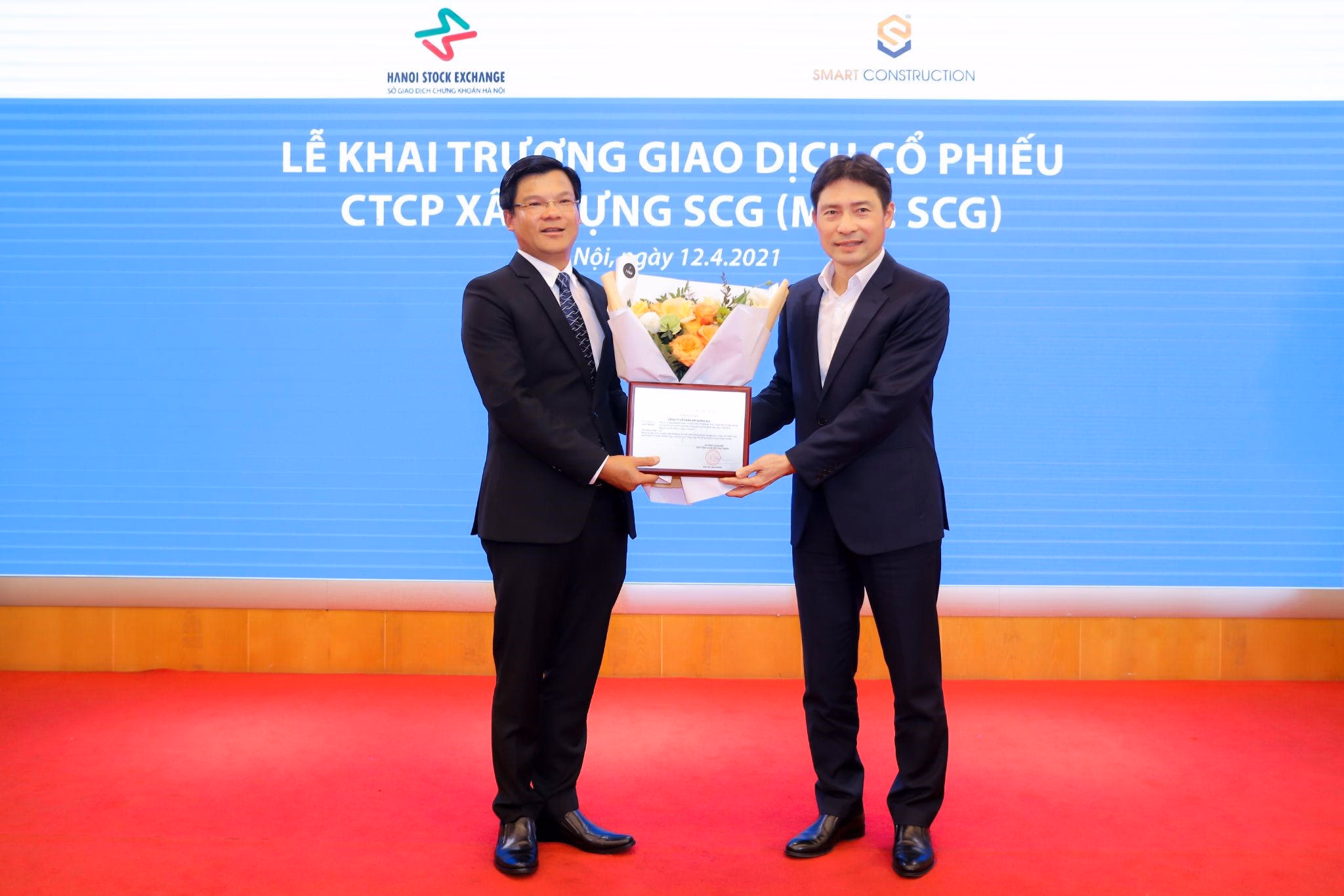 Sáng hôm qua, 12/4/2021, Sở Giao dịch Chứng khoán Hà Nội (HNX) đã trao chứng nhận đăng ký giao dịch cổ phiếu cho Công ty Cổ phần Xây dựng SCG. Theo đó, 50 triệu cổ phiếu (mã chứng khoán: SCG) đã chính thức được chào sàn với giá tham chiếu trong phiên giao dịch đầu tiên là 20.600 đồng/cổ phiếu (vốn hoá của công ty đạt 1.030 tỷ đồng khi chào sàn).
