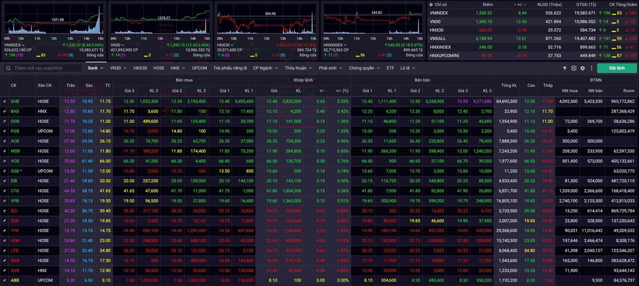 Thị trường chứng khoán ghi nhận mức tăng điểm tương đối mạnh trong phiên giao dịch 24/3. Kết phiên, chỉ số VN-Index tăng hơn 8 điểm, đóng cửa tại 1.330 điểm. Chỉ số VN30 tăng 12,43 điểm, đóng cửa tại 1.390 điểm. Thanh khoản trên sàn HoSE đạt 19.580 tỷ đồng với hơn 926 triệu cổ phiếu được khớp lệnh.