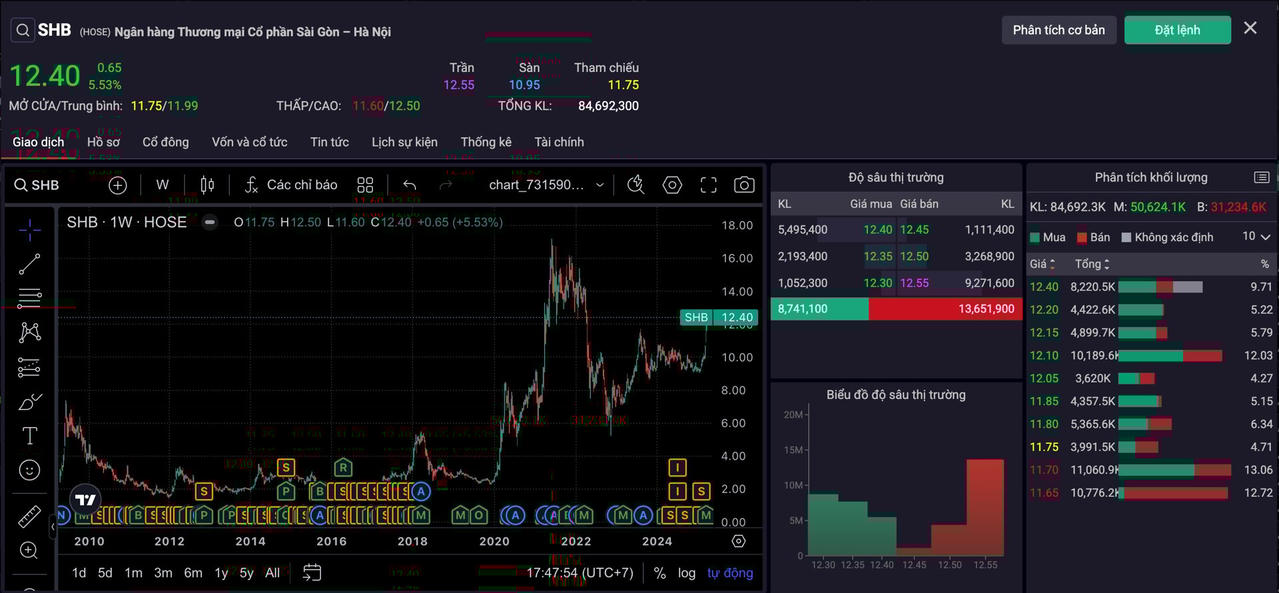 So với thời điểm đầu năm, cổ phiếu SHB đã tăng gần 40%. Với mức giá 12.400 đồng/cp, vốn hoá ngân hàng vượt ngưỡng 50.000 tỷ đồng.