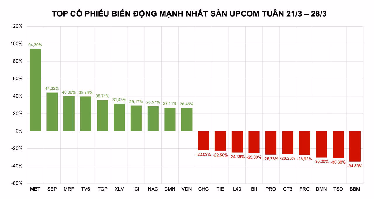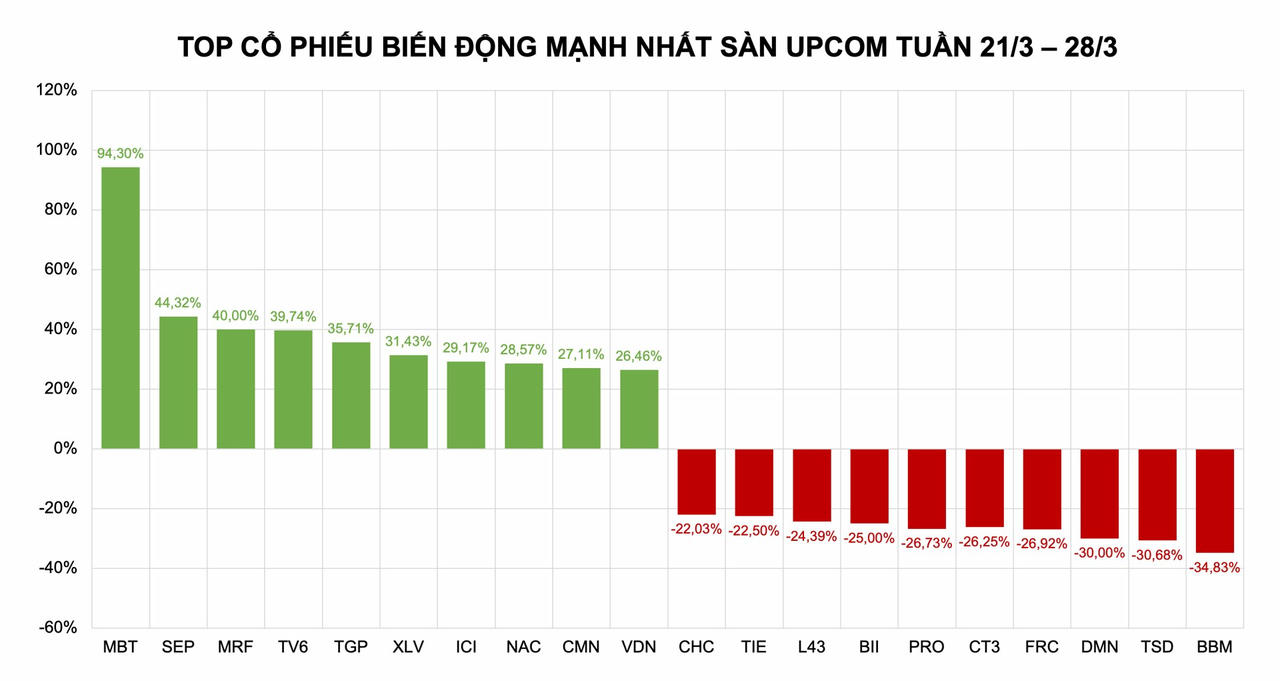 Trên sàn UPCoM, top 10 cổ phiếu tăng mạnh nhất ghi nhận sự góp mặt của MBT (+94,3%), SEP (+44,32%), MRF (+40%), TV6 (+39,47%), TGP (+35,71%), XLV (+31,43%), ICI (+29,17%), NAC (+28,57%), CMN (+27,11%), VDN (+26,46%).